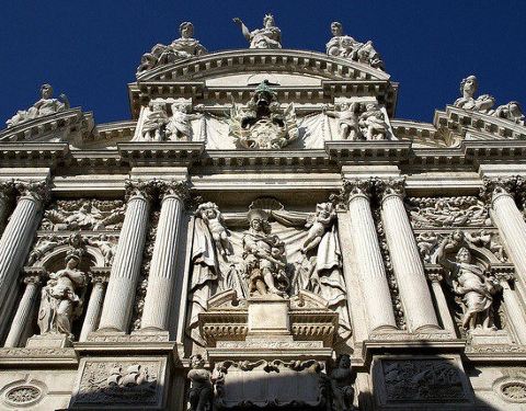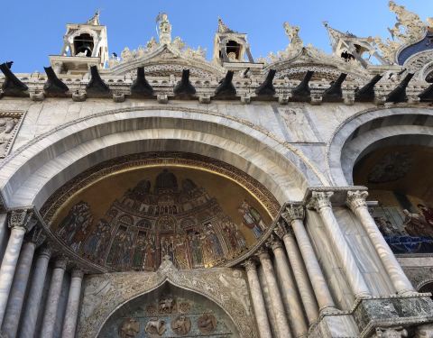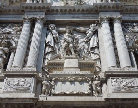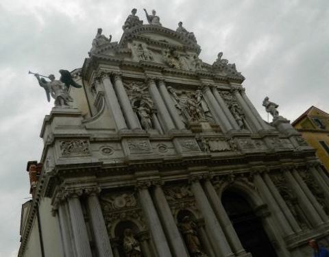 百合圣母教堂也在圣马克广场的旁边,在这座教堂前,前面有一些优秀的雕像,总共有十四座雕像,巴洛克式风格有而是个大理石柱子,两侧各有一座浮雕雕像,在飞檐周围还有七个雕像。