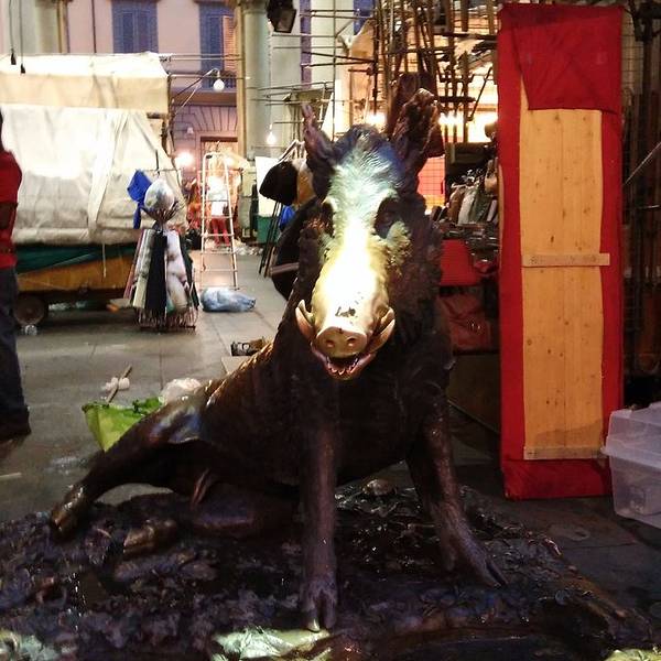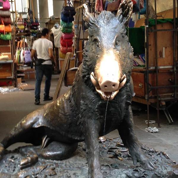今天的景点真的很密集,走到了小猪市场,市场里的店已经收摊了,来这里看小猪的人还真是多呀,等了好久才有能拍上没有人的小猪。 小猪市场从市政广场向西100米不到就可以看见,这里也有很多本地的皮具以及纪念品,小猪市场和圣洛伦佐市场是佛罗伦萨的两大市场,皮具都还不错,有意的朋友可以来这里看看,市场南边就是小猪喷泉,是一个金属制作的小野猪喷泉,摸摸猪鼻子,往喷泉里投硬币,就能再回到佛罗伦萨。 具体做法就是,手指压硬币在猪舌上,然后放手,硬币就滑下来,能不能掉入下面的泉眼里真的要看运气了,我试了试,真的掉进去了,是不是预示着我的运气就是还能再来到佛罗伦萨。