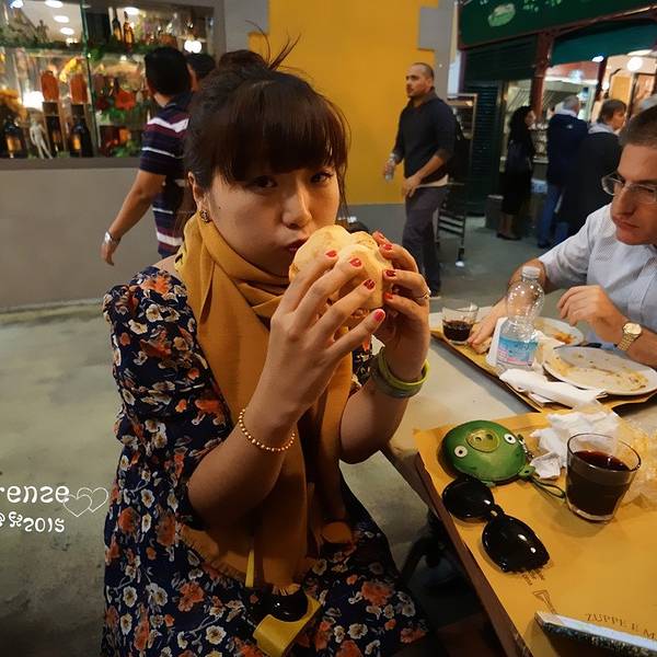 除了T骨牛排,牛肚包也是佛罗伦萨的特色美食,而且非常平价。 当然,如果你不太能接受内脏类的食物,还是不要轻易体验了。 我们选的这家店就在中央市场,这里是一座非常local的美食集市, 你既可以享受红酒配牛排、海鲜大餐这样的“高级料理”,也可以品尝意面、汉堡等快餐, 甚至还有中华料理小铺,当然来买的基本都是外国人, 不知道他们觉得小笼包、煎饼果子的味道如何。 牛肚包有点类似陕西肉夹馍,两篇面包中间夹着炖好的牛肚, 淋上青酱和辣酱,一份挺大一个的。 不过欧洲人对牛肚的处理还是有点不细致,会略有一些内脏的腥味, 必须趁热吃,面包浸过煮牛肚的汤汁后很入味。 青酱的味道不是每个人都能接受,感觉有点奇怪。 算是一次“入乡随俗”的尝试吧。 PS:中央市场里有意大利极为罕见的免费WC。人气很旺是个美女姐姐呢看起来平平无奇的牛肚包,其实内涵乾坤