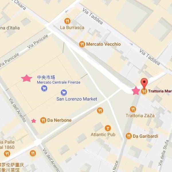 佛罗伦萨的中央市场也是一个很妙的地方。位置就在距离火车站不远处,从我们的酒店步行到这里大约15分钟。在一座百余年的老建筑里,是充满生活气息的大市场(左上粉色星星),蔬菜、水果、熟食、海产...还有引得一众游客驻足的当地香料、橄榄油、红酒,简直应有尽有。这里还有大名鼎鼎的牛肚包Nerbone(左下粉色星星)。市场周一到周六7:00-14:00营业,周六下午还会增加16-19营业时段。(下图是看上去很美味的外卖食品,很多人排队)(Nerbone,但是这款貌似不是牛肚包,是牛肉包,倒是也挺好吃)中央市场的门口是San Lorenzo市场,充斥着卖旅游纪念品和皮具的小商贩,但是我没敢在这里买过东西,怕被“宰”....