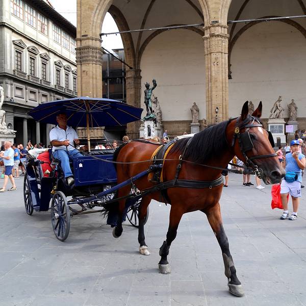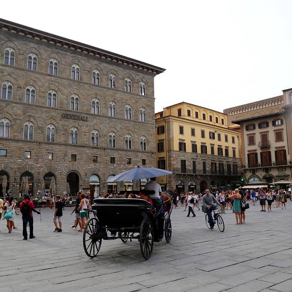 市政广场有露天雕塑博物馆的美誉,周围环绕着乌菲兹美术馆、佣兵凉亭和众多的咖啡厅、酒吧。知名的圣母百花大教堂就位于它的正北方,距离约200米,从小巷步行就可以到达。参观完广场,拐个弯就到了附近的乌菲兹美术馆。市政广场的这个名称与如今的市政厅,也就是美帝奇家族的旧宫息息相关。旧宫目前还在使用,坐落在广场明显的位置,依然傲视着整个广场。经过几次修缮,它的建筑风格带有明显的时代特征。外部是中世纪的建筑特色,16世纪成为美帝奇家族大公爵科西莫一世的官邸后,内部则是文艺复兴的建筑特色。旧宫的入口处装饰着城市徽章,一楼大厅里有众多雕塑,米开朗基罗的《胜利》就在其中。里面是一个博物馆和一个五百人议事大厅,议事大厅不允许参观,但是塔楼可以登顶。塔楼高94米,就像是旧宫的一顶皇冠,从这里可以眺望圣母百花大教堂。旧宫的门口有一排雕塑,有名的莫过于米开朗基罗的作品《大卫》,不过真迹已经在1873年被移到佛罗伦萨学院美术馆收藏。旧宫的左侧是美丽的晚期哥特式风格的琅琪敞廊。里面陈列着一组重要的雕塑作品,其中有一座贝纽维多·切利尼的《珀尔修斯》。《珀尔修斯》是一座青铜雕塑,表现的是一个健美的青年,左手高举着血淋淋的美杜莎的头,右手持刀,左腿弯曲。敌人的身体就在他的脚下。雕塑高高的底座,以及复杂的图案雕刻,足见作者技艺的娴熟。旧宫的右侧是《海神喷泉》,水池正中的双轮战车上站着巨大的白色海神波塞东像,水池四周还有多姿多彩的青铜雕像。水池的北边竖立着章博洛尼亚创作的美帝奇家族科西莫一世骑马像,它比这里其他的一切见证了更多佛罗伦萨的历史。广场四周是造型朴素的历史建筑。傍晚从市政厅广场穿过,可以听到拉琴的艺人。琴声飘荡,令人心醉。夏季游客多的时候,还会有艺人在广场跳舞。