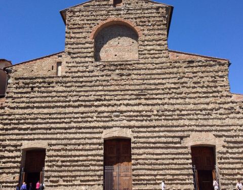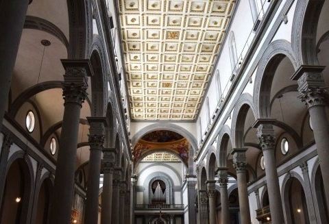 圣洛伦佐教堂是美第奇家族教堂,由3个时代、建筑样式都不同的空间(布鲁涅内斯基建造的旧圣器室、米开朗基罗建造的新圣器室、17世纪的君主礼拜堂)构成。 教堂建于公元393年,经过1095年,1461年两次扩建,在1740年完工成为目前看到的样子。期间米开朗基罗设计了它的正面,外表采用了白色大理石,外立面由凹凸的灰砖砌成,独特又质朴无华。布鲁涅内斯基则对其进行布局,使这座历史悠久的教堂成了意大利教堂的参照物。 旧圣器室属于文艺复兴初期的新古典主义风格,摒弃了多余的装饰,充满优雅、清朗的气氛。进入新圣器室需要绕到教堂后面的美第奇家族礼拜堂,这里收藏着米开朗基罗的9尊雕像。从雅致的庭院经米开朗基罗设计的台阶登上二层,是圣·洛伦佐图书馆,收藏有由美第奇家族历代收集的共1万册古书。教堂的墓园埋葬了几乎所有美蒂奇家族的成员。