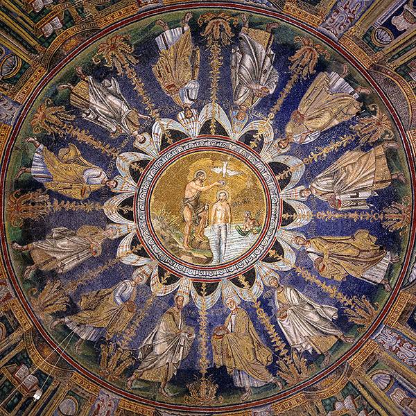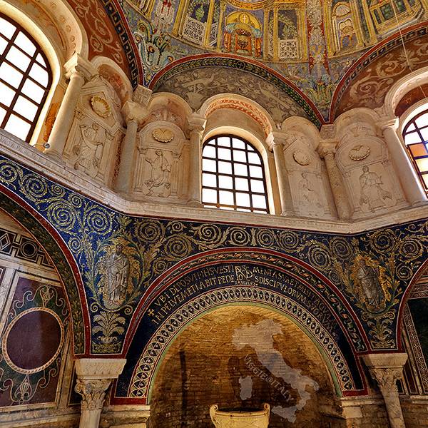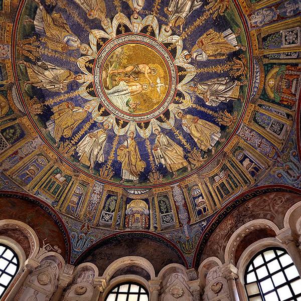 在拉文纳游览主要是靠步行穿梭。蓝色和金色的镶嵌画和谐且特别这个教堂被称作“正教徒洗礼堂”,是430年左右时建立起来的拉文纳地区第二座建筑,5世纪末的时候由主教内欧尼全部翻新,在此添加上了镶嵌画。