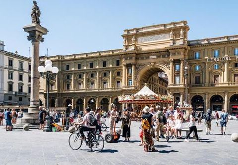 佛罗伦萨的共和广场是意大利佛罗伦萨市中心的一个重要历史广场,以其优雅的建筑、丰富的文化底蕴和充满活力的现代氛围而闻名。19世纪末,佛罗伦萨成为意大利王国的临时首都,在此期间,广场经历了大规模的城市改造,形成了今天的新古典主义风格,并更名为“共和广场”,以纪念意大利的统一和共和精神。广场的标志性建筑包括高大的胜利拱门,上面刻有“古老的城市中心从百年荒芜中重获新生”的铭文,象征着佛罗伦萨的城市复兴。广场周围环绕着精美的拱廊建筑,其中有名的是Gilli咖啡馆,自开业以来,一直是艺术家、作家和知识分子的聚集地。此外,广场上还有丰裕之柱,这是一根古老的石柱,历史上曾是佛罗伦萨城市边界的标志。共和广场不仅是佛罗伦萨的地理中心,更是文化、历史与现代生活交汇的象征,吸引着无数游客前来感受这座城市的独特魅力。