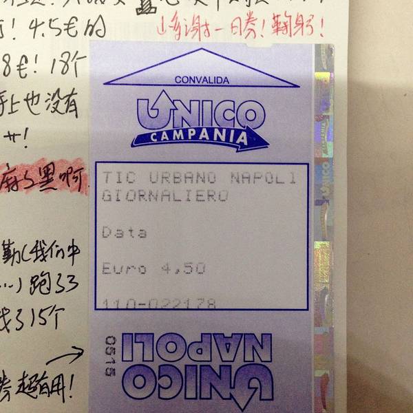圣埃尔默堡在沃梅罗山顶上,而饭店就在沃梅罗山腰上。所以早饭后退房存掉行李就准备先坐缆车上山看看再说。 做功课的时候就决定要买拿波里的一日券,前台推荐我们去烟店里买可以便宜一点并说缆车 乘车点里可能没有售票机……嗯很合理的建议对吧。 但是呢呵呵呵呵在拿波里充分体现出意大利人的混乱来了!烟店小哥不会说英语!半句也不会!只能表达他们店里没有一日券只有单次券你们爱买不买!没办法只好花1欧买了单次券…… 腾腾腾走到缆车站,发现这不是有售票机嘛!显示有一日券可以卖!但是不知道这机子怎么用!叫来旁边的工作人员问问,小哥猛按了一通机子表示:机子有点问题,只接受1元硬币!2元也不行!!艹艹艹!4.5欧的一日券4个人就是18欧!谁特么身上会有18个1元硬币啊!!!!!拿波里的天麻麻黑啊!——这就是我当时的感想! 01 感谢我们中间唯一没感冒活蹦乱跳的王小呼……关键时刻健气极了! 拿了15元纸钞跑了三家咖啡店才兑成了硬币……还花了一个欧买了个蝴蝶酥屁颠颠叼着跑回来了!赞!给个大拇指!体力派关键时刻派用场! 事实证明一日券用场很大。拿波里的公交标示是一泡污我昨天就说过了!我们走错好几次地铁札口!要是都用单次券就亏大了!还好是一日券可以随便刷!太感谢了!鞠躬!