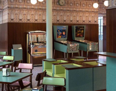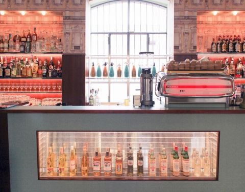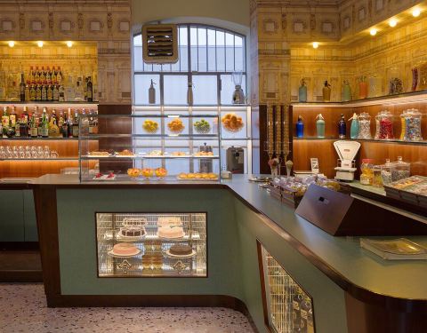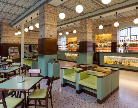楼下有一个衣柜间,非常有趣。会去普拉达艺术基金会是由于之前看见新闻说《布达佩斯大饭店》的导演韦斯·安德森在米兰开了一家咖啡厅,周末闲暇就去了一趟,顺道逛了一圈新落成的基金会展馆,非常值得称赞的一家店,就是餐厅面积非常小