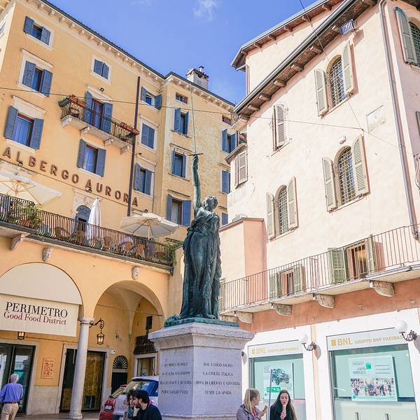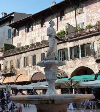 香草广场(Piazza delle Erbe)位于维罗纳市区北部,据说这里在罗马时代被称作弗洛·罗马诺,是市民进行仲裁、政治集会的公共场所。 现在,各式各样的水果、蔬菜、花卉商铺覆盖了整个广场,看上去更像是一个大集市,广场中央有建于14世纪、名为“维罗纳的爱人”的喷泉,广场周围的建筑物都是从中世纪到文艺复兴时期的豪华别致的楼堂馆所。