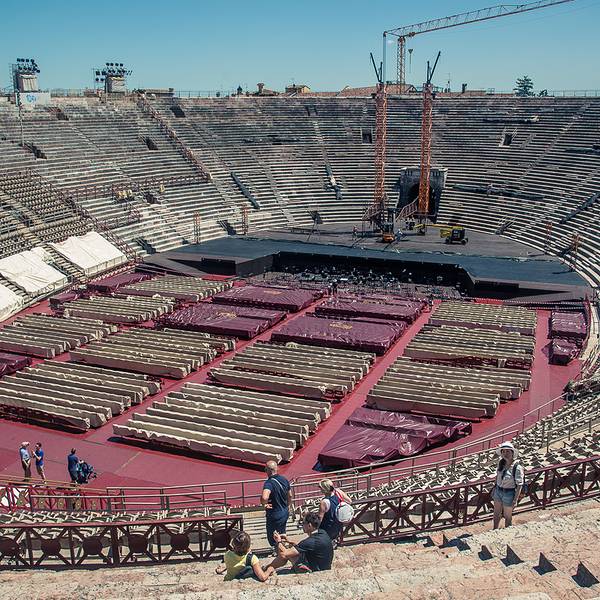 真希望能有机会在这里看场演出啊。去的时候,正好快有演出了,门口贴了海报。里面也在搭建舞台广场边就是圆形剧场了,这个不同于罗马斗兽场,现在的圆形剧场依然承接一些歌剧演出,想象一下在这样的建筑里看一场歌剧是什么感觉