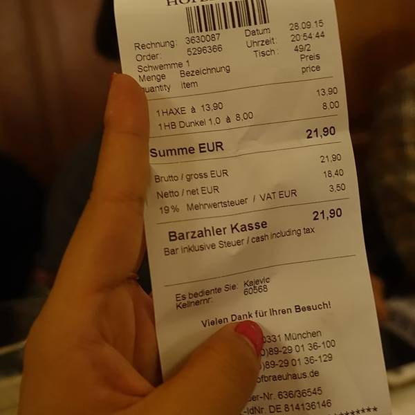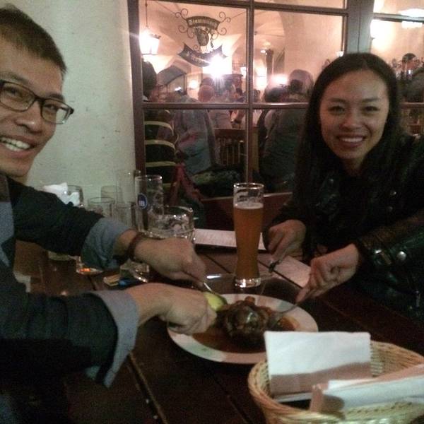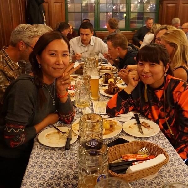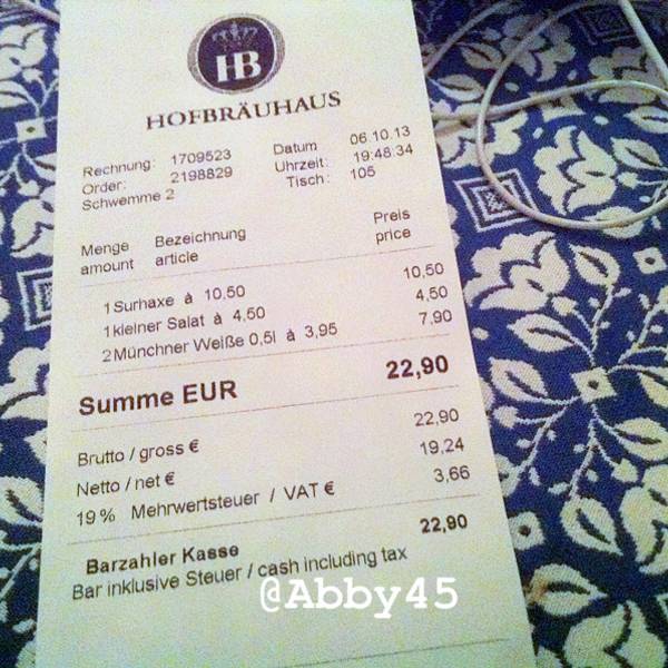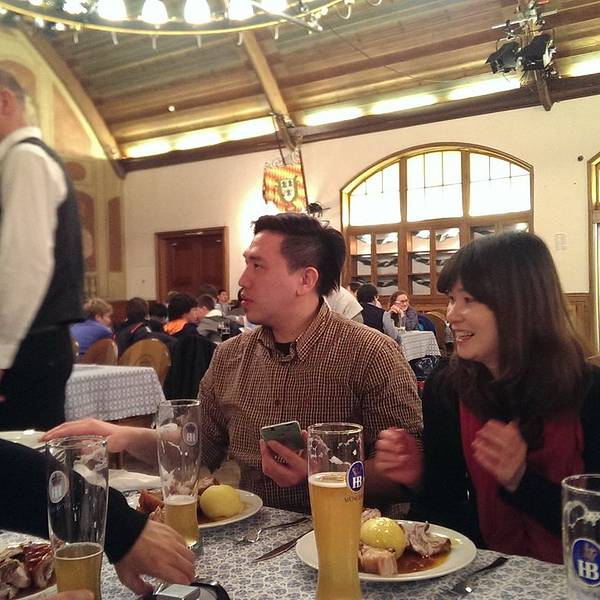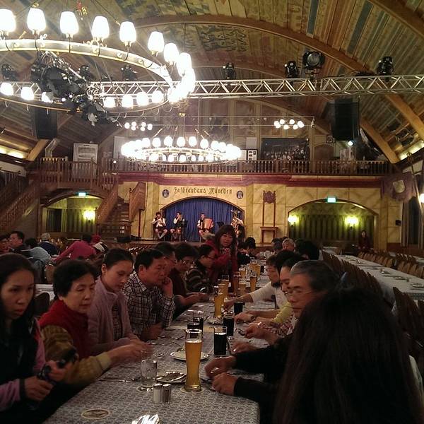 进去之后,整个HB是一种全场狂欢的场景,没有服务员招呼你坐下,要自己找位置,每个区域都有专人负责,找到座位之后,再招呼服务员点啤酒和主菜,我平时一点肥肉都不吃,为了入乡随俗,拼了,点了大肘子。这种自嗨的场景在国内绝对是没见过。旁边做了三个人,其中一个男的还曾经在北京工作过一年的时间,竟然开口跟我说“干杯”,德国人很严谨,我问了几个景点的问题,也和我说的很到位。