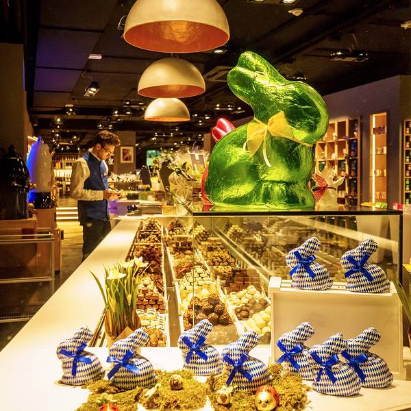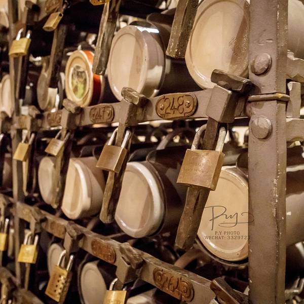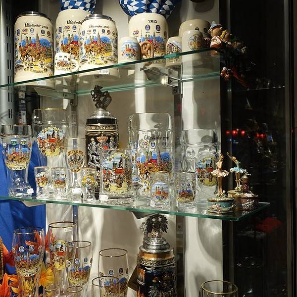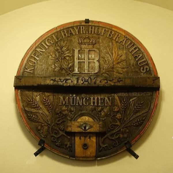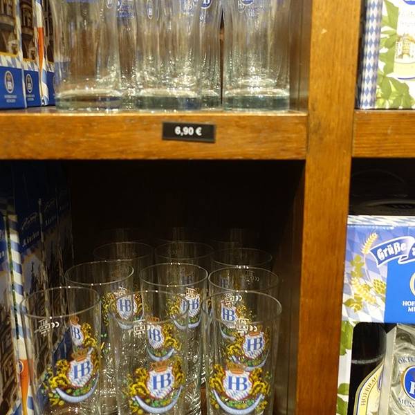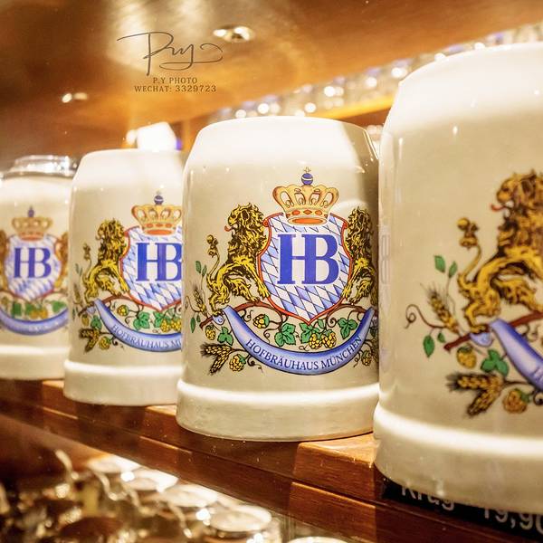 大大一杯。就给自己一个买醉的理由吧,值得痛快来一大杯。杯子比我的脸还大。不过味道是小麦的香很清醇,一点都不苦,终于吃了正宗德国猪手了。皮脆肉嫩,非常可口。至于德国香肠嘛,感觉跟广州在一些中档西餐馆吃到的没啥不同。存酒也是这里的一个文化。如此整齐有序的存放也是餐馆里面的一道小风景。HB的杯子王者复活节快到了,所以慕尼黑到处是巧克力