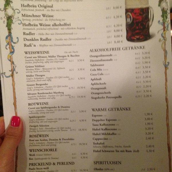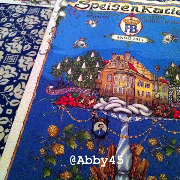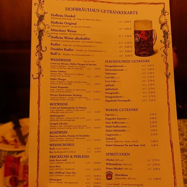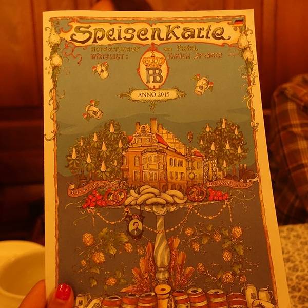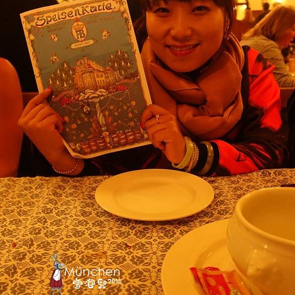 傍晚的慕你黑还下起雨,我们三人都没带雨伞,他带着我们到慕尼黑hb啤酒屋里面去躲雨兼介绍。还特别拿了慕尼黑HB啤酒屋的菜牌给我们看,然后他悄悄说:“收好带走,当一个旅游的纪念品。”