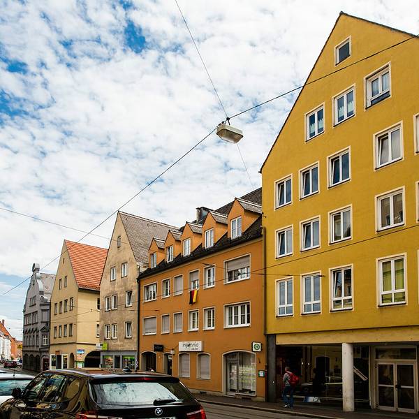 马克西米里安大街是欧洲保存完美、最漂亮的中古时代街道,街道两旁文艺復兴时期特色的四、五层小楼栉比鳞次,富丽堂皇,古色古香。山形墙和门面有浅黄、淡绿、粉红、浅灰及淡褐等各种顏色,再配上红色或深褐色的坡形屋顶,显得色彩明快、古雅大方。