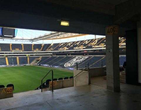 在球场售票处轻松找到黄牛,讨价还价后六十欧搞定。不了解球队,但是体验一下也很好法兰克福转机间隙,决定去球场,球场离机场就一站地铁。在球场售票处轻松找到黄牛,讨价还价后六十欧搞定。不了解球队,但是体验一下也很好