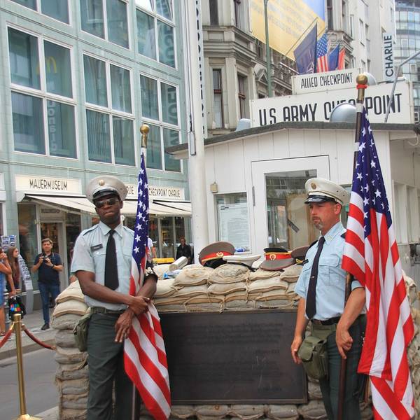 参观冷战期间的最著名标志物,与苏联和美国“大兵”合影。