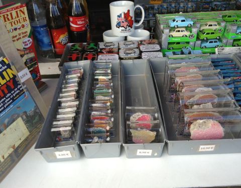 特别是这么商业化的查理哨台。人们争相上去合照,一下觉得这个景点low爆了。在这里买点纪念品倒是不错在这里买点纪念品倒是不错。看了一下摊点普遍更便宜一些。我最后货比三家,买了一个石头+地图的冰箱贴约5欧,一个兄弟之吻冰箱贴3.9欧,算是很便宜的了。大块的石头买不起啊,反正都是假的。