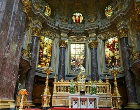 柏林大教堂坐落于柏林市区博物馆岛的东侧,背靠施普雷河。 柏林大教堂建于1895年-1905年,在二战中曾遭毁坏,修葺工作持续至今,但它依然是柏林抢眼的标志性建筑,素有“博物馆岛入口之称”:三座巴洛克的大圆顶气势非凡,面向施普雷河的四层建筑采用了巴洛克宫殿的装饰风格,金碧辉煌;西侧的钟楼服役至今,祷告的钟声悠远绵长;爬过260级台阶便可在大教堂顶端欣赏柏林市区的壮丽景色。 教堂正立面的台阶用花岗岩铺成,弧形拱门颇为瞩目,两侧由希腊式的科斯林石柱支撑,门上装饰有青铜浮雕和马赛克壁画。 祭坛设在比布道堂高出七个台阶的高台上,祭坛由汉白玉和缟玛瑙制成的祭坛,周围是镀金的围栏,金光四溢。 高达72米的穹顶是柏林大教堂较为精华的部分,穹顶由镶金的马赛克圣画装饰,同样也是出自维纳之手,描绘了圣徒布经传到的场景,每幅画有39平方米,共用了2000余种色彩,十分震撼。穹顶周身镶有玻璃窗,圣洁的光线透过窗户洒下,恍如圣灵降临。 接下来可以移步去洗礼堂参观,入口两侧摆放着德国雕刻家安德烈亚斯·施吕特( Andreas Schlüter)为国王雕刻的灵柩。 二层是大教堂博物馆,展示了柏林大教堂建筑的模型、历史图纸、设计、原始部件和雕刻等,墙壁上的照片记录了教堂在二战时被轰炸和损毁的情景。博物馆内还设有很有意思的多媒体“模拟台”,可以探身进去近距离感受柏林大教堂的穹顶的魅力。 拾级而上,跨过第270级台阶,便来到了教堂顶部的拱顶回廊,站在此处,你可以清晰地看到教堂顶部的天使雕像,正门顶端的圣象和十字架。回廊的视野十分开阔,施普雷河、德国历史博物馆、柏林洪堡大学、柏林旧博物馆等美丽景观都尽收眼底,不妨在此多驻足停留一会儿,享受柏林的迷人的美景吧。 离开前,别忘了去地下的地下的霍亨索伦王朝的墓室瞻仰一下,这里安葬了从十六世纪到二十世纪初霍亨索伦王朝94位王室成员的灵柩,弗里德里希三世、选帝侯约翰·西塞罗、大选帝侯等都在此长眠。 参观结束后,可以去教堂前的广场小憩一下,感受柏林人悠闲的生活节奏。