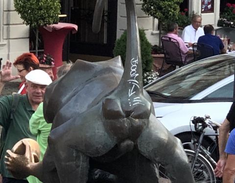 本平淡无奇的铜猴,因为背后的涂鸦多了欢乐一笑,简直太逗了,真是服了欧洲这些涂鸦爱好者了。这座铜塑为古老的老桥平添很多趣味!