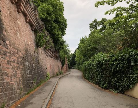 西端入口:从俾斯麦广场出发向北,过Theodor-Heuss桥后一直走到Ladenburgerstraße右转,向里走即可到哲学家小径上山。此段上山路为坡路。