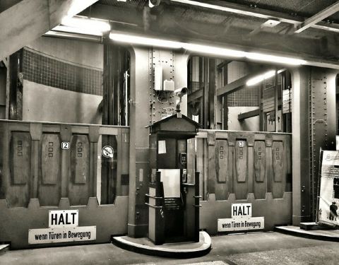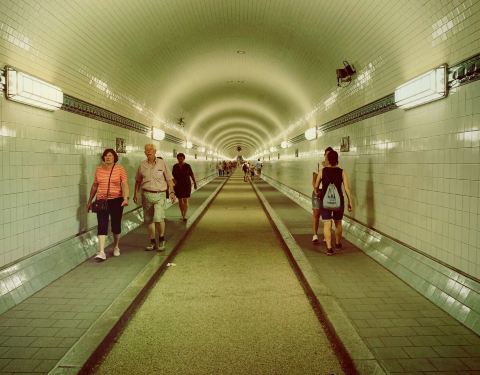 19世纪末,港口城市汉堡正在迎来自己的黄金时代,新的码头和造船厂沿着易北河南岸拓展,超过两万名工人却只能利用轮渡往返南岸和汉堡市区。修桥被否定了,当时易北河通航需要净高55米的桥梁,修出来太贵了,所以,改修隧道吧。1911年,426.5米的易北河隧道投入使用,双洞双向,还有人行道,两端靠电梯将汽车(还有马车)和行人带到地下24米。1975年新的易北河隧道建成之后,(旧)易北河隧道再也不重要了,现在偶尔有汽车会利用这条将近106年历史的过江通道,单程2欧元,更多是可以免费通行的行人和自行车,以及怎么会有那么多对这个感兴趣的游客。[