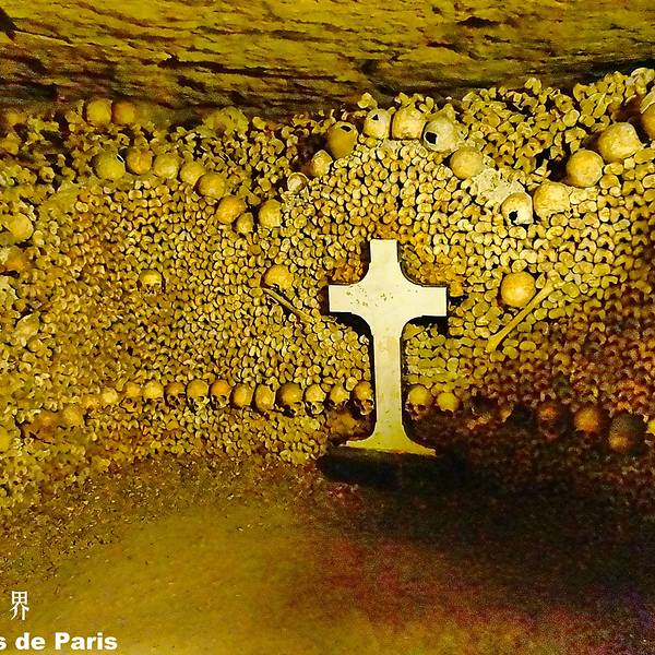 此景点后段过于惊骇,心理承受能力不高者慎入。 在查阅大部分资料偶尔得见一角介绍这个地方-巴黎人骨公墓。 据介绍说这是为了节省地方,把这一片数百年的古公墓内的骸骨罢放于一条数公里长的隧道内。 为了探索这个骇人的地方又不敢一个人去,只好把同房的室友叫上。 由于去得有些晚,到的时候排队的长龙己绕了一圈。轮到我们时己是四小时后,门票10欧每人,每次限制200人进入。 惊险时刻开始……!沿着盘旋而下的阶级不知转了多少圈后进入阴森的地下世界 ……! 穿过阴暗的地底走了近十多分钟,除了阴冷并没看见其它……! 正有些感到乏味时,前面出现一些洞穴壁刻……! 终于……半小时步行后,穿过最后这道门……!地狱之门打开了……!走道两旁堆满白骨无数……!延绵而去,阴森恐佈……!好多白骨堆中放着十字架 此景点后段过于惊骇,心理承受能力不高者慎入。 小孩不许入进入。由于人数管制,要参观要提前安排时间 ,不管出于何种原因,进道入不要触碰任何事物,对亡者要心生敬畏尊重。