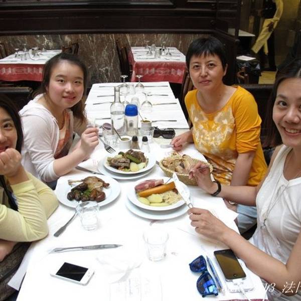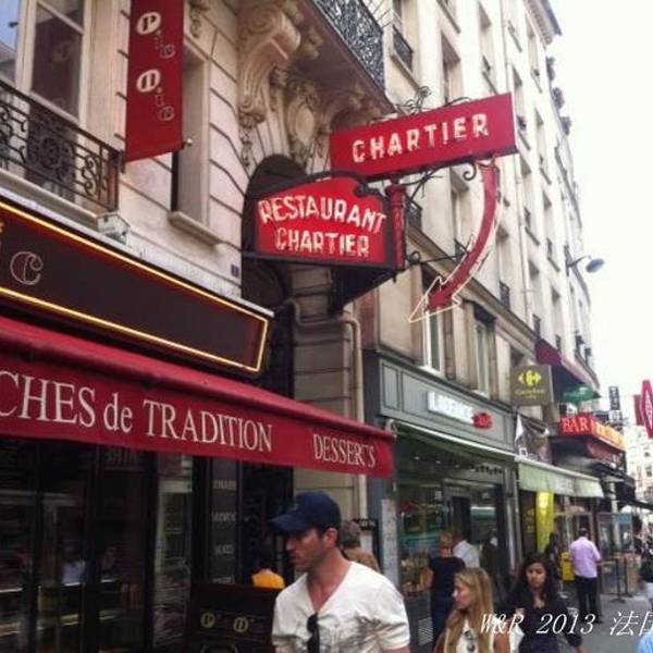 吃了冰淇淋继续往前走,在广场尽头四个人再也走不动了,不是真走不动,而是想吃夜饭了,馋老虫爬出来了,一拍即合,一致目标米其林推荐法国餐厅RESTAURANT CHARTIER,的中文名“能人居”。找到地铁站,换乘一次地铁到达,根据地址在大街上来来回回找,其他门牌号都有,就是跳过“能人居”的门牌号,问了路边餐馆里的服务员,指了方向还是没找到,最后问到开服装店的法国人,很热心地出门指给我们看,原来要从大马路拐个弯到小马路上,就能看到高高悬着的红色店牌了。