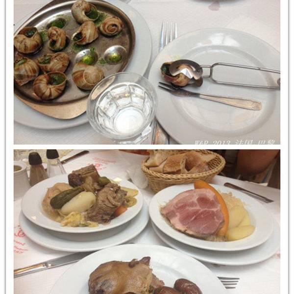 我向来都把价格列为餐厅的重要参考指数,网上推荐了一家比较有名的便宜又量大的餐厅,Restaurant Chartier。虽然网上也说味道现在普普通通,但还是无法抗拒便宜和量大这两个诱惑。 我们去的时间还算早,但还是要排队,我们排上队没多久之后,后面的队伍就变的很长。 餐厅里面的氛围很好,毕竟是百年老店,但总感觉客人还是游客为主。 因为其他桌的游客也跟我们一样,完全看不懂菜单…… 还好服务员都懂英文,可以让他们一个一个解释每道菜都是什么。 我心想这效率……难怪门口排那么长的队。 法国人实在是太傲娇了,整个店里大部分客人估计都是不懂法语的游客,这餐厅还非坚持只用一本法语菜单……傲娇到无法直视! 总算点上了菜,吃的是比较传统的烤鸭烤鸡和焗蜗牛,味道实在是普普通通,不推荐。 价格在巴黎确实是大排档价格,人均十欧左右。