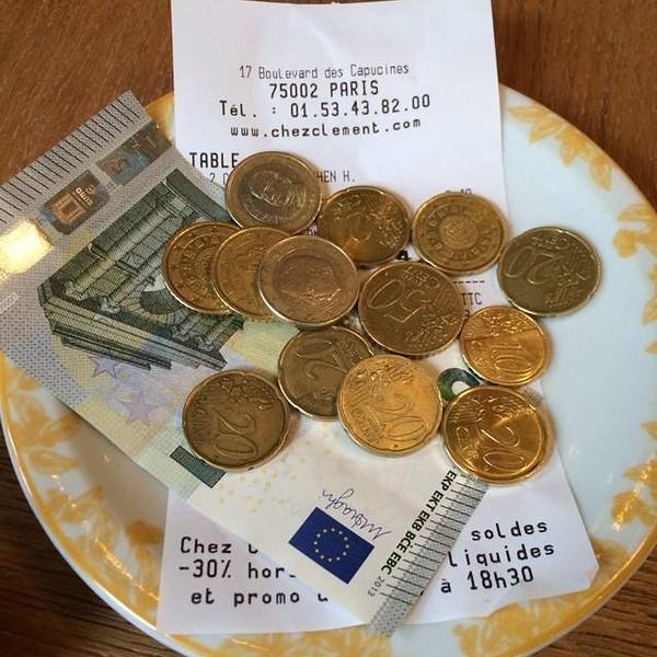 在巴黎的第一顿饭吃的超级欢乐~高晓松说外国人算数都不好,一般我们去买东西如果是97块钱,你可能会给老板102块,老板找你5块整钱。谁都知道你的意思,但是外国人算数不好,所以他们不知道,通常情况下会还给你2块钱,再找你3块。原本我也只是当做笑话来听听,没想到还真有这样的事情。这顿饭一共消费43.1欧,我们拿出了3.1元的硬币,外加50元的纸币,嗯,你们懂我们的意思吧~结果这可把两服务员为难坏了,叽叽喳喳商量了半天,结果给我们找回了一堆这样的钱~哈哈哈哈