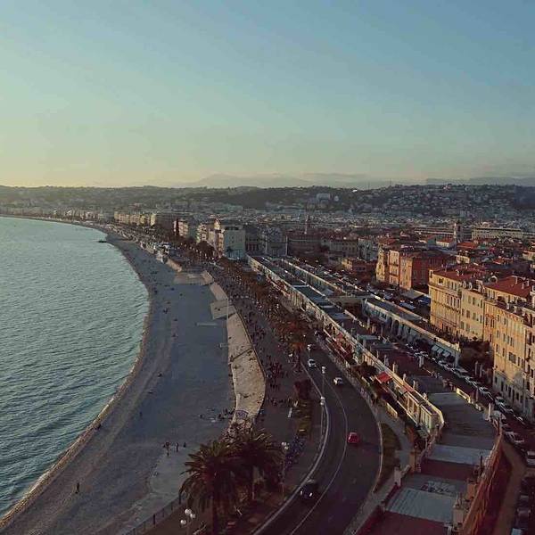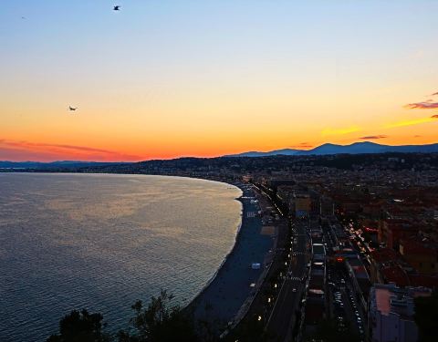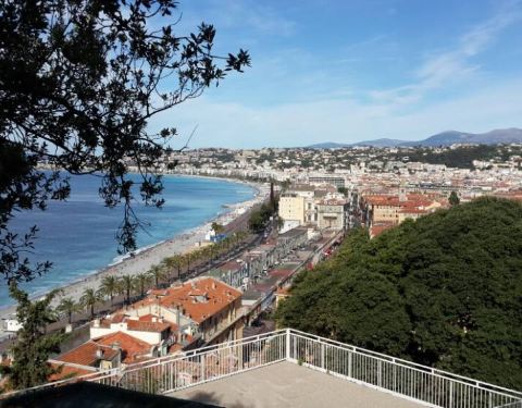 城堡山位于英国人漫步大道的尽头,可以坐有轨电车T1线到vielle ville站下即是。如果从火车站附近出发步行约15分钟可到。城堡山几千年前是希腊的要塞,如今是俯瞰天使湾的好地方。沿着城堡一路有楼梯上去,门票是免费的,登上去后就会看到整个天使湾和尼斯城的样子,正前方就是尼斯机场,所以经常有飞机从头顶飞过,上面也有望远镜,1欧元使用一次。城堡山位于尼斯城东面,所以上午的时候拍天使湾是顺光,下午是逆光的。但是傍晚你也能欣赏一场唯美的日落。如果不想走路上去的话也可以走到Rus des Ponchettes坐电梯上去,电梯是免费的,早上10点开始运营,步行上去也仅5分钟。在城堡山的下面就是“I love Nice”的地标,整个游览时间约1小时,到尼斯必去的地方。