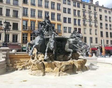 此雕塑用了21吨铅铸成,是里昂最著名标志性景观广场比白莱果广场小一些,但周边建筑更为密集,可以说是里昂的心脏所在。在这个广场上,最吸引人眼球的当属气势磅礴的铜马战车女神大型喷泉雕塑。此雕塑用了21吨铅铸成,是里昂最著名标志性景观。