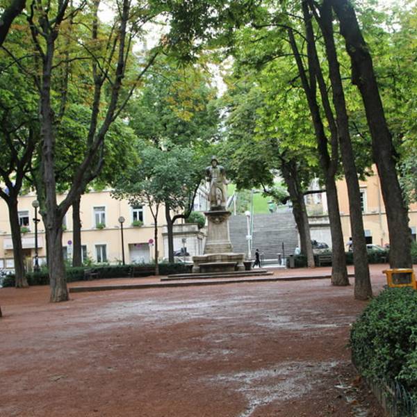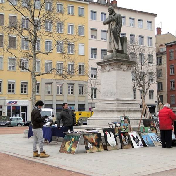 过了步行街继续往前走,就能看见Place de la Croix-Rousse(红十字广场)。广场上矗立的雕塑是在法国丝绸工业发展史上最重要的人物,也是织机工匠出身的里昂人——Jacquard(贾卡),他对织机的改革使法国丝绸工业达到了空前的进步。他是纹板提花织机的积极改革创新者,于1977年制成了配置整套纹板传动机的脚踏式提花织机,只需一个人操作便能够织出六百针以上的大型花纹织物,许多式样较为简单的花纹由此达到了自动成形的程度。后来,这种织机发展成了全自动织机,在纺织业上被称为贾卡机。新织机不但缩短了产品的成形时间,更重要的是减轻了劳动量,减少了工作人数,这必然引起了大批工人的恐慌和随之而来的抵制及破坏,因为使用贾卡织机后,原来需要六名工人完成的工作现在只需一名,这就意味着大批工人的失业。贾卡多次受到人身攻击,甚至有人对他以死相逼,更严重的是,土坊里的新型织机不断被损坏和焚烧。尽管如此,革新的成果还是遍及全国,1812年,整个法国已装置了一万一千多台贾卡自动织机。虽然这位风云人物因每台织机的提成而成为巨富,但在革新过程中所冒的风险,却在他的身上留下了深深的烙印,他变得沉默和孤僻。红十字广场上的贾卡雕像,有一种苦涩甚至阴沉的表情,这无疑是这位天才革新家当时的心境写照。