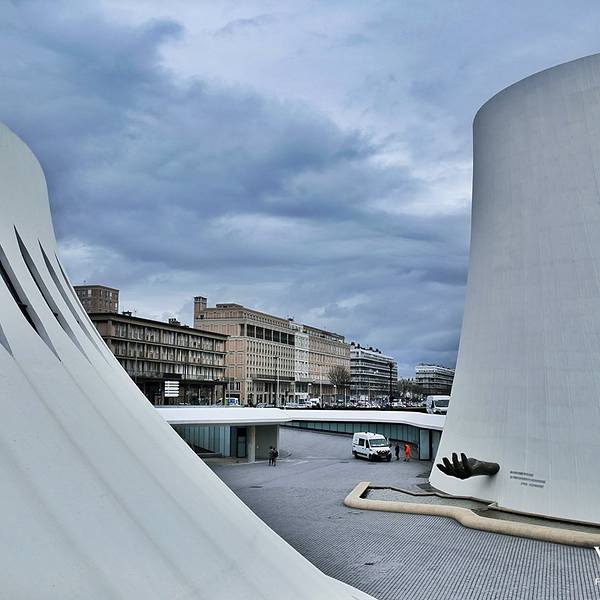 两座白色的锥形“烟囱”从广场中心徐徐升起,与摩登的想象力尽情旋转,难道外星人的神秘工厂在此安营扎寨了