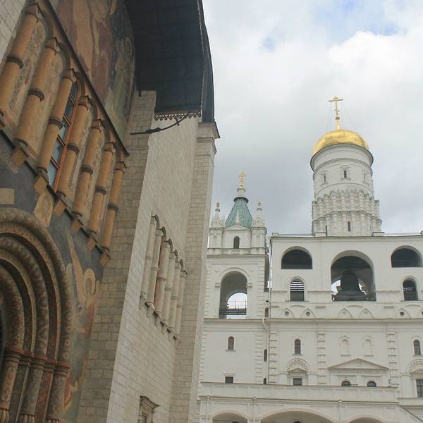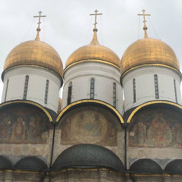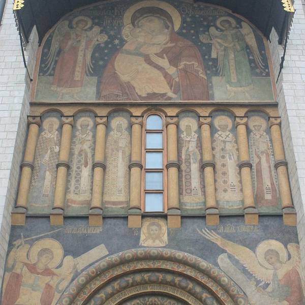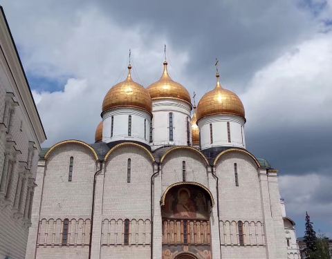 位于大教堂广场的北面,五个金色的圆顶远看就很醒目,白色的外墙略显低调,不同于圣瓦西里大教堂的奢华,教堂里内部的装饰壁画十分精美