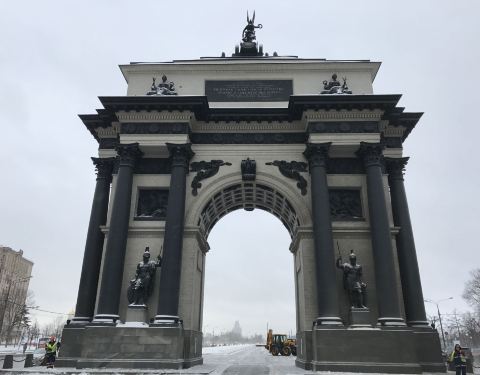 ...来体型要略微小一些,但是一样的很宏伟,而且雕刻和基座也非常的精致,凯旋门的背后是一个小小的广场莫斯科的凯旋门与巴黎的凯旋门比起来体型要略微小一些,但是一样的很宏伟,而且雕刻和基座也非常的精致,凯旋门的背后是一个小小的广场。