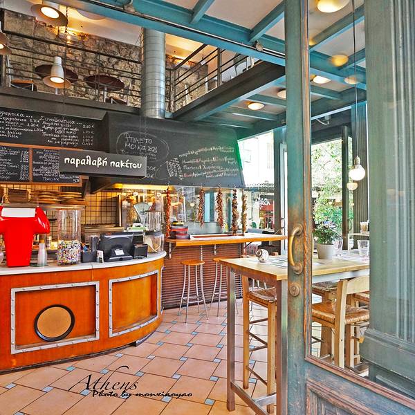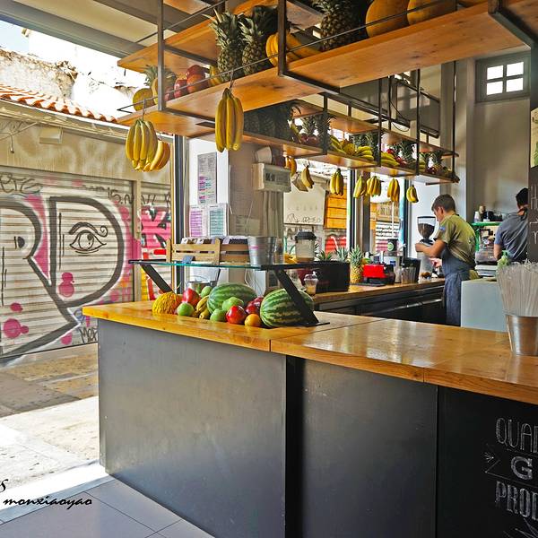 路过一间很好看的pita店,普拉卡区有很多咖啡店挺有趣味,下午可以随意找一间喝个下午茶以卫城为坐标,找到了蒙纳斯提拉基(monastiraki)广场,黄色建筑物是monastiraki 地铁站。从广场四周的小巷便是热闹的普拉卡商业区