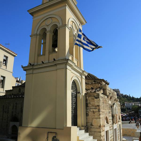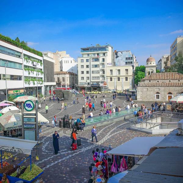 位于宪法广场西面的蒙纳斯提拉奇广场是一个历史悠久且充满活力的广场,仍然保留着当年奥斯曼帝国统治时期下的建筑风格和拜占庭艺术风格,包括传统陶艺博物馆——唯一一个在雅典开放参观的清真寺。这里的店铺琳琅满目,有纪念品店、鞋店、服装店、家具店、旧书店、首饰店、希腊乐器店等等。广场地面铺的大理石砖呈现独特的马赛克风格,带有一种古老的艺术感觉,仿佛一踏上去就穿越回了曾经的传说年代。广场中心几乎每天都有不同的街头艺人在卖艺,常常吸引一大群人围观。广场边重新修建的新古典主义风格地铁站也是一个值得游览的景点,地铁里还保留着当年挖掘时发现的古迹。