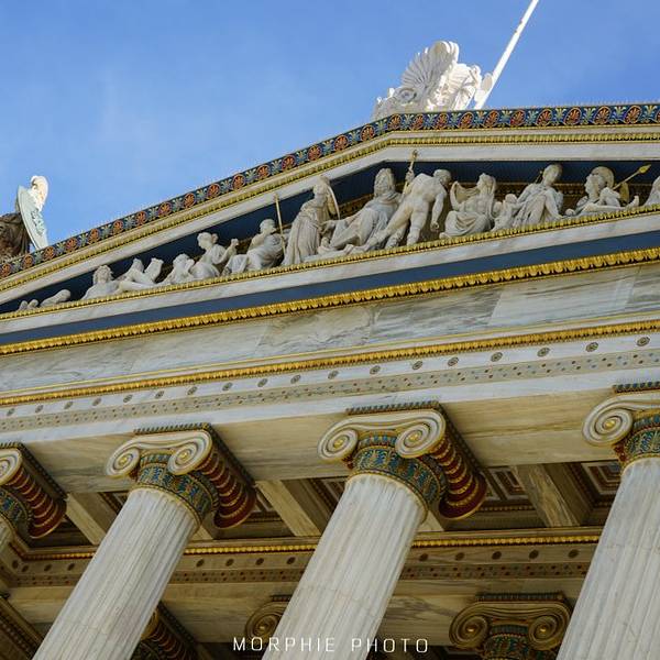 外面的两根柱子上分别雕刻着身着盔甲的雅典娜和手持乐器的阿波罗立像,雅典学院是模仿卫城建造的,