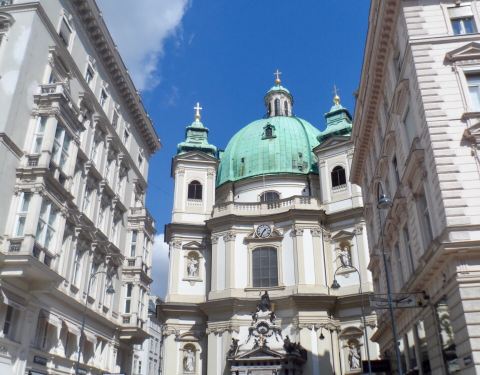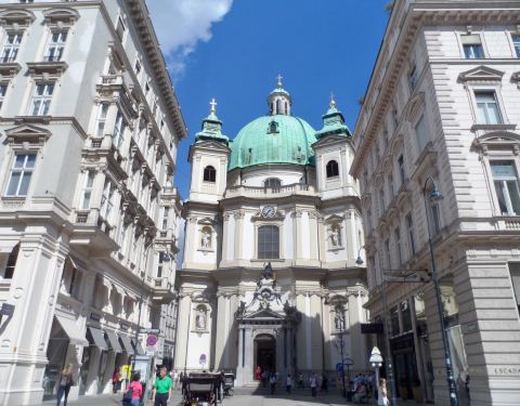 感觉这座教堂还是比较低调的,在里面颜色颇深比较普通,外观比较漂亮圣彼得教堂在奢侈品一条街那边,在一个小巷子里面远远的就可以看到孔雀绿色的穹顶了。感觉这座教堂还是比较低调的,在里面颜色颇深比较普通,外观比较漂亮。
