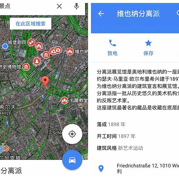 分离派会馆由1898年一群老艺术家所建,其建筑设计主要源于华格纳的学生奥布里希,一颗由金色月桂片包成的圆顶十分显眼,在阳光下闪闪发光,馆外墙上的浮雕精美细致,每一处设计都隐含着对当时保守势力的反抗。现在的会馆已变成了一座艺术集中区,是观光游览的好去处。