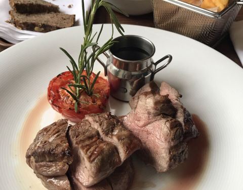 朋友点的牛排,我点了羊排端上来,看上去不像羊排的样子,原来是去掉骨头的,全是肉。而且没有什么羊膻味,味道挺清淡的,搭配的薯条。