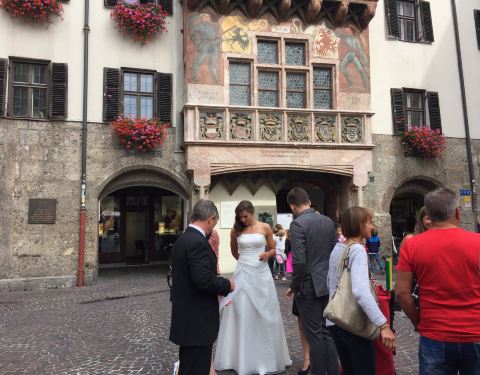 参观的人很多黄金屋顶是在神圣罗马帝国时期一位皇帝所修建的,其实他本身是一个很小规模的,局部性的建筑,具有一个黄金铸造的小屋顶。参观的人很多。