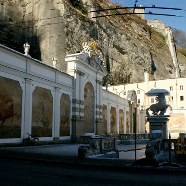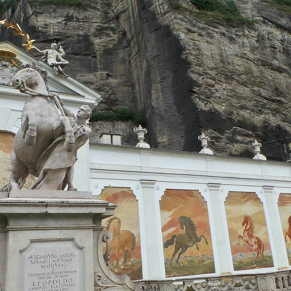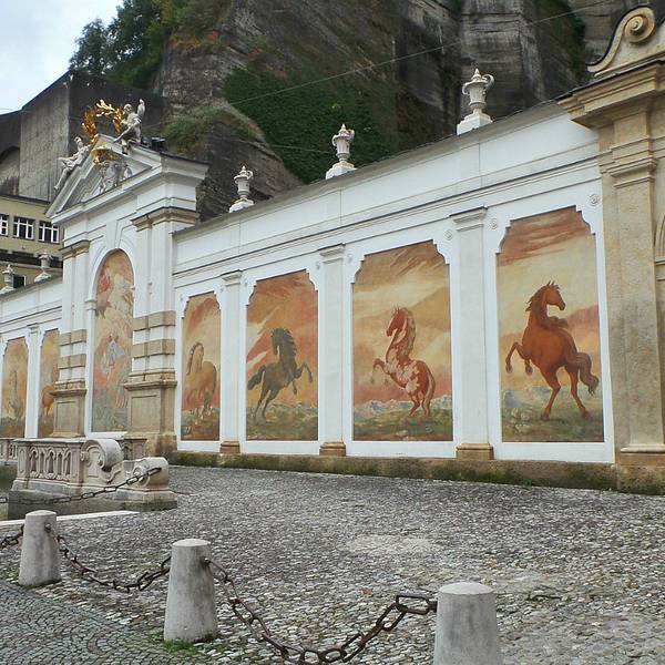 整个建筑更像是一个大的影壁加上一组喷泉和水池,在广场中部有一匹奔腾的骏马的雕像,影壁上有众多马的图画洗马地位于卡拉扬广场,在萨尔茨堡城市的西边紧靠近山崖。整个建筑更像是一个大的影壁加上一组喷泉和水池,在广场中部有一匹奔腾的骏马的雕像,影壁上有众多马的图画,栩栩如生。