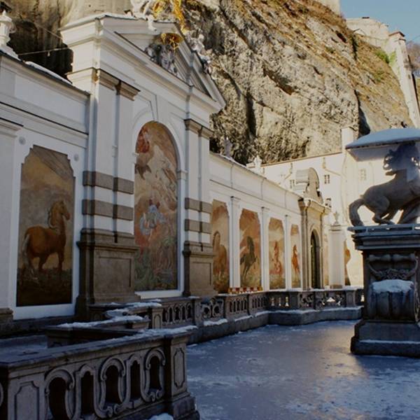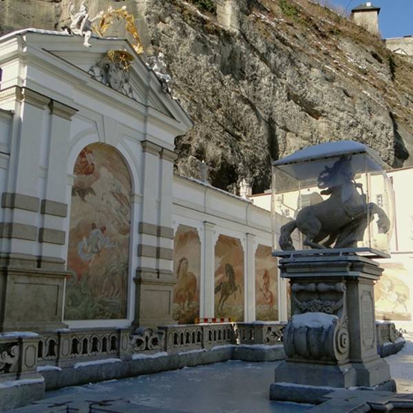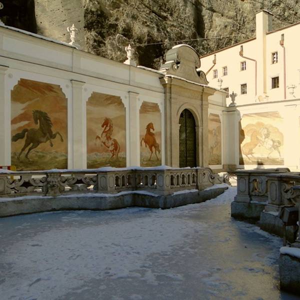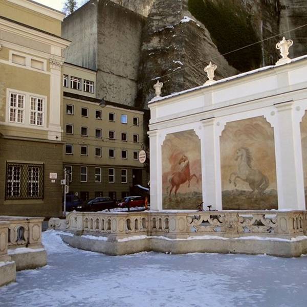 广场一边是Pferdeschwemme(洗马池),紧靠在Monchsberg(僧侣山)山脚,整个水池都被冰封住了。