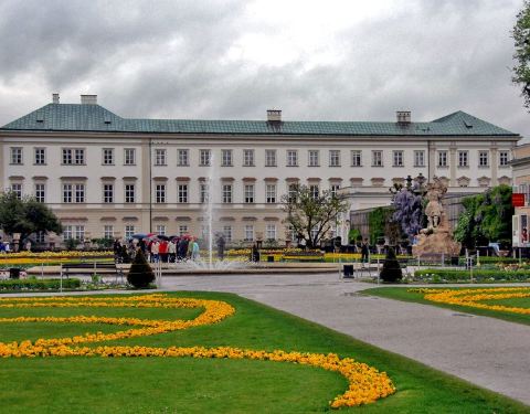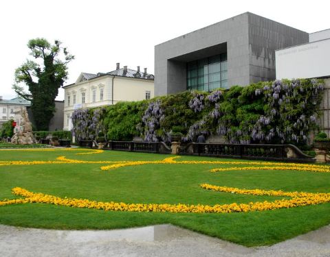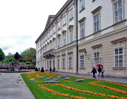米拉贝尔宫殿和花园始建于1606年,位于萨尔茨堡的萨尔茨河北岸,此地在迪特里希去世后由后继者更名为米拉贝尔宫殿。如今这里成为了萨尔茨堡的市政厅。 花园则是较受游人喜爱的拍照地。这个集聚了罗马雕塑、喷泉、迷宫的巴洛克式花园,曾是知名电影《音乐之声》中,女主角玛丽亚带着孩子们欢唱“Do-Re-Mi”的地方。 大理石厅 由于这里之前曾遇到过大火,因此留下来的是通向花园的大理石楼梯和大理石大厅。大理石大厅今天已经是世界上较美丽的婚礼大厅之一,这里几乎每天都有新人前来注册结婚。厅内到处可见可爱的小天使雕塑,墙上则是各路希腊神祇的雕像。小天使姿态各异,憨态可掬,活泼可爱,仿佛坐在云端嬉戏。 除此之外,大理石大厅主要用于会议、纪念活动和音乐会。每年7月中旬到8月底是有名的萨尔茨堡艺术节的举办时间,此时古典乐界的世界知名团体和艺术家都会来到萨尔茨堡为观众们带来精彩的演出。 花园看点 这个花园其实就是一座小小的街心花园,景色主要靠花草的造型和色彩来衬托,因此不建议冬天来这里游玩。花园中央是一座大型喷泉,四周有许多希腊神话中的人物雕像。花园的后方走上去就是侏儒花园,里面放着几个小矮人,造型比较夸张,据说原型是主教大人和情妇所生的孩子们。花园里还有2座独角兽雕塑,处处充满了浪漫与童话色彩。 5-10月天气好的时候来这里游玩,可以坐在花园的长椅上晒晒太阳,看着紫藤瀑布流泻而下,掩映着粉红色的墙和白色的窗棂,优雅而恬静,从花园可眺望远处的萨尔茨堡城堡。