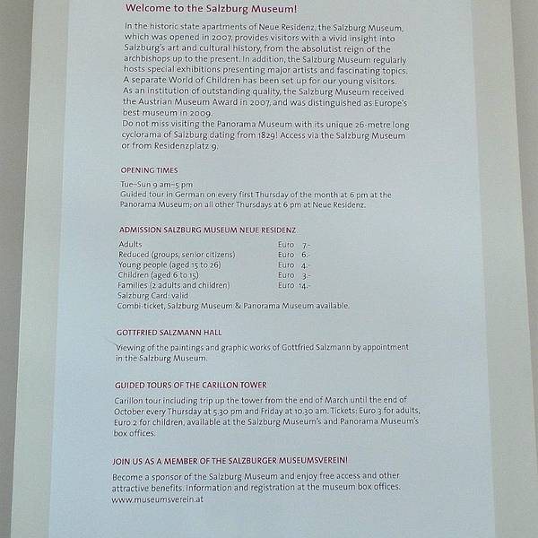 博物馆位处在莫几扎特广场旁边,持萨爾斯堡卡免费入场。馆内主要是展示这个城市的历史和背景。除了图片和文字外,还有影音讲解,令整个参观旅程比较生动。