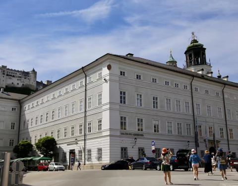 莫扎特广场位于主教广场东北侧,广场上的莫扎特塑像由萨尔茨堡人捐款于1842年9月5日落成,莫扎特的两个儿子出席了落成典礼。1997年萨尔茨堡老城被列入世界文化遗产名录时,塑像前面的地面上的刻字记录了这一历史时刻。莫扎特广场1号是萨尔斯堡博物馆。