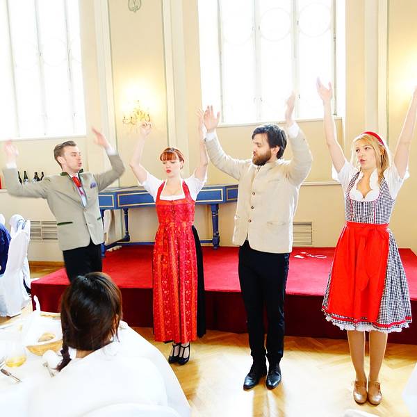味道很棒哦!萨尔茨堡小圆子,经典的饭后热甜品。 更让人惊喜的是,用餐的同时还能欣赏一场《音乐之声》表演, 精彩诙谐的表演,伴随着《哆来咪》的音乐,又让我们对这座音乐之都平添了几分好感。左二小姐姐的老公是中国人哦,她的中文讲得很好!午餐过后,我们乘坐缆车登上霍恩萨尔茨堡城堡。