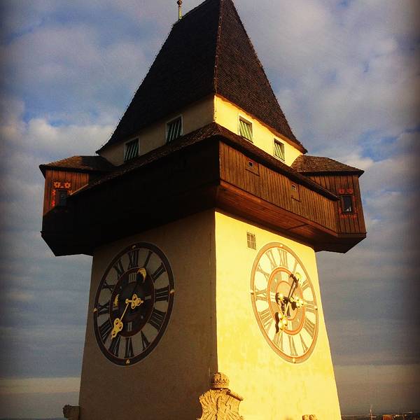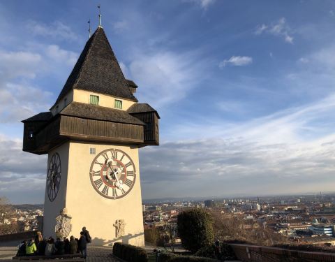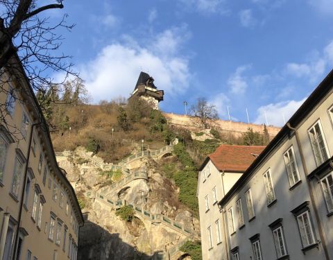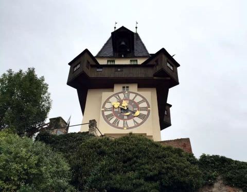 宫殿山主要景点有大钟塔、碉堡遗址、城堡山博物馆、卡森玛特舞台、炮台、斯达巴斯特监狱等。塔楼始建于13世纪,前身是一座守望塔,1588年进行重建,至今都为当地的人民准确报时。宫殿山高437米,乘缆车或步行都可以上去。从老城区拔地而起的宫殿山及矗立其上的大钟已经成了格拉茨的象征。 登山游览主要有三种方式:想轻松一点可以选择搭2分钟直达山顶的索道电缆车,更快的是搭乘透明电梯,半分钟直达山上。然后,还可以沿着山壁石梯上山。建议搭索道或电梯上山,再走石阶下来。下山同样有三种选择:乘电梯下山;从克里斯小道步行至山腰平台;或者选择一条浪漫幽静的山间小路去往卡梅黎特广场,然后向斯博特街方向前进,直到海仁街出口。