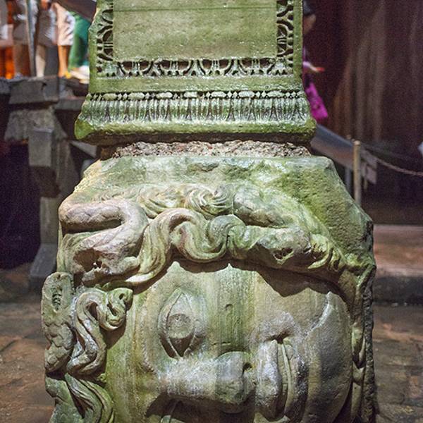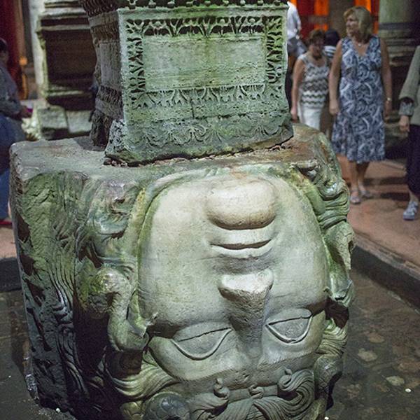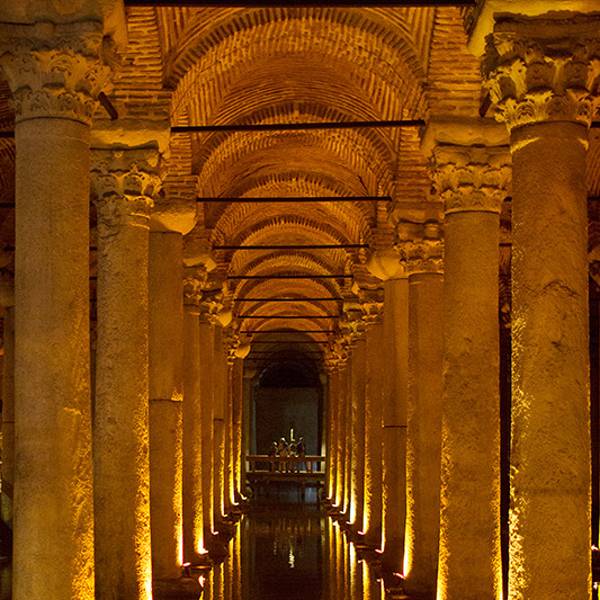 在蓝色清真寺和圣索非亚大教堂附近的耶莱巴坦地下水宫给这座都市增添了一丝神秘的色彩。在伊斯坦布尔城中,建有为数众多的地下宫殿,耶莱巴坦地下水宫是其中规模最大的一座。整座水宫长140米、宽70米,由336根高9米的粗大科林斯式石柱支撑着巨大的砖制拱顶,据说这些石柱都是从安塔托利亚地区的神殿中搬运过来的。据说旧时,伊斯坦布尔老城的居民总能在夜间听到地下有潺潺的流水声,却没人知道其中缘由。直到上个世纪60年代,考古学家在蓝色清真寺附近发现了一个庞大的地下水宫,也就是著名的耶莱巴坦地下水宫,才最终揭开了这一神秘现象的面纱。