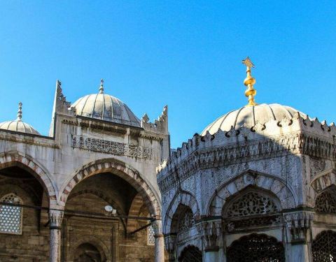 苏莱曼尼耶清真寺位于加拉塔大桥的南端,濒临金角湾,也被称为新清真寺。不过它并非真的很“新”,实际上已经有超过400年的历史了。它于1597年开始动工,中途历尽风雨,甚至曾经停工,后来在1663年完成。 这座清真寺的设计风格效仿了蓝色清真寺和苏莱曼清真寺,有一个巨大的前庭,侧旁有两座高耸的拜塔,中庭有一优美的水泉,一系列的半圆顶围绕着一个主穹顶。走进清真寺,可以看到宽阔的圆顶,以及金色叶片、雕刻大理石和色彩斑斓伊兹尼克瓷砖装饰,显得非常华丽。这座清真寺代表了土耳其帝国时期建筑的高水平,值得细细参观。 此外,寺外常有一大群鸽子汇集着,还能看到猫咪的身影,让人感觉十分惬意,也是拍照的好地点。