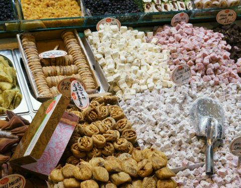 香料市场也叫埃及市场,是伊斯坦布尔大、古老的香料市场,建于17世纪60年代。如今这里除了有种类繁多的香料,也出售货品齐全的旅游纪念品,而且相比大巴扎来说要更为便宜,值得花时间细心选购。种类齐全的香料市场位于金角湾加拉塔大桥的南侧,是个“L”型的建筑。市场有多个出入口,上百家店铺,各种土耳其的调料和天然草木都能在此找到,甚至还有中国厨房里不可或缺的花椒、大料、茴香、孜然等。购买干果等食品除此之外还有粒大饱满的开心果、花生等坚果,以及奶酪、果酱、腊肉、甜品和香气扑鼻的烤榛子等。很多热情的店主会从大袋子里铲出一堆让游人免费品尝。通常在香料市场购买干果价格要比商场便宜一点。另外,茶种类也不少,除了普遍的苹果茶,还有柠檬茶,有茶叶式的,也有冲泡式的。挑选纪念品如果对香料不是很感兴趣,也可以买些小香料礼品包,颜色鲜艳、价格不贵,不失为送礼的好选择。当然,各种工艺品和旅游商品也琳琅满目,令人目不暇接。